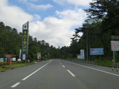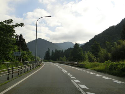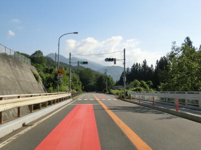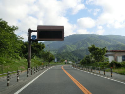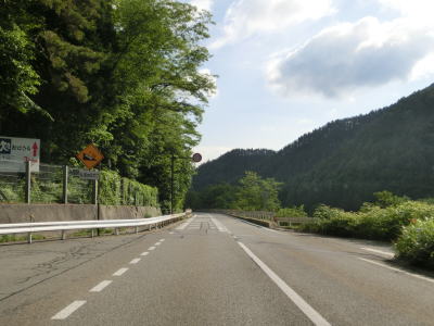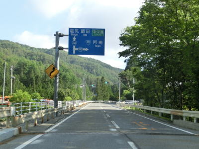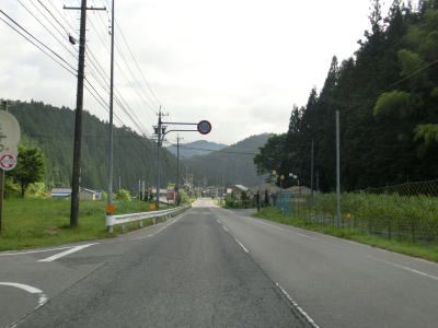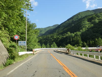 | 山間部の小さな村だけあって役場を通り過ぎるとすぐに沿線の家屋が少なくなる。小川川に沿った家屋の間を2車線道路を走る。非常に緩やかな勾配だが、中野集落に約400mの長さの登坂車線が設置されている。 | ||