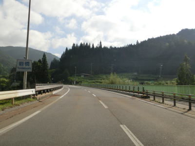 | 野入川の流域に来ると周囲の家屋が増える。緩やかな勾配と緩やかなカーブも2車線道路を快走していると集落が途切れる。野入川に沿ってカーブの多い状態を走っていると蛇行する川を2ヶ所渡った後に右ヘアピンカーブを曲がりながらさらにもう1ヶ所の橋を渡る。 | ||