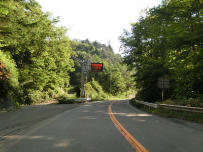 | 平谷交差点を過ぎてすぐに平谷村の役場の前を通過し、その直後に道の駅「信州平谷」を通過する。平谷交差点から500m程度しか離れていないので、R153のトレースだけでなくR418をトレースする際にも利用しやすい道の駅である。道の駅以降は上村川に沿っており、緩やかな勾配を上る。周囲に集落がない訳ではないが、バイパス化されているため沿線の家屋は少ない。 長い上り勾配を走っていると避譲車線が現れる。これまで登坂車線となっていたものが避譲車線とされているが、用途は同じである。距離は400m程度と短いが、区間内に2ヶ所の簡易パーキングが設置されている。 |