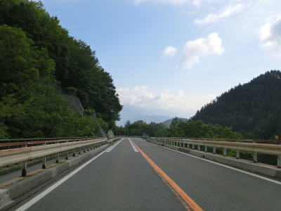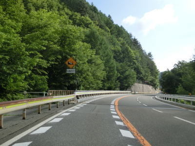 | 登坂車線が終わった直後に信玄橋を渡る。橋の北詰の村道の交差点の西に信玄塚があり、戦国武将の武田信玄が亡くなった地と言われている。これまでよりも少し急になった上り勾配の2車線道路を走っていると2ヶ所目の登坂車線が現れるが、こちらは200m強とあまり長くなく、その後不動沢橋を渡る。 | ||