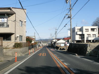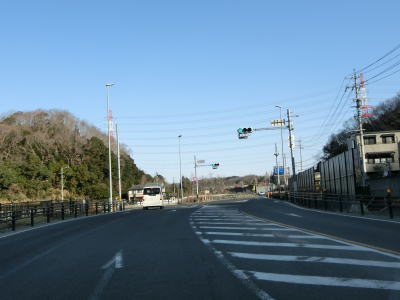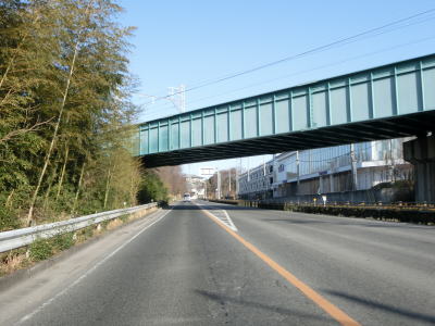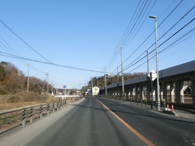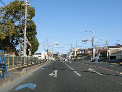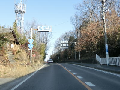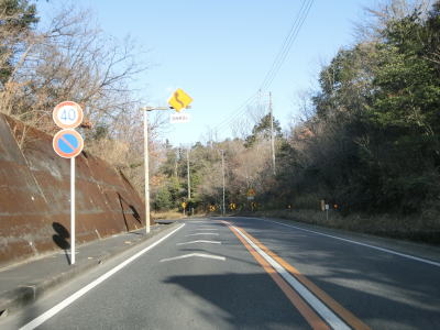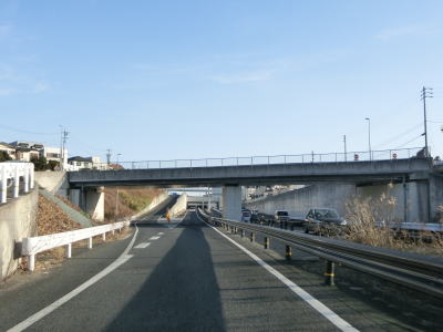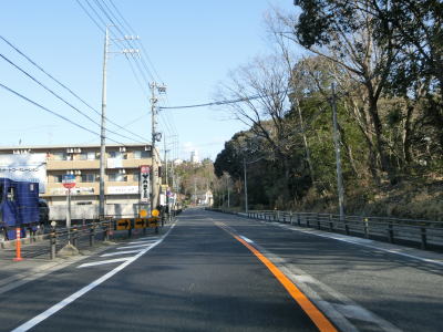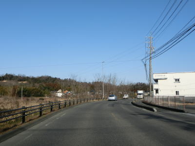 | 愛知環状鉄道をくぐってからは緩やかな上り勾配となる。路側帯が狭くなるのに前後して沿線の家屋が少なくなるが、西側の高台には造成された住宅地があり、人里離れた場所ではない。左カーブを曲がっていると峠部分を越えて下り勾配に転ずる。 | ||