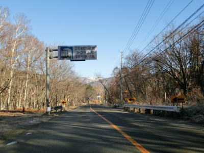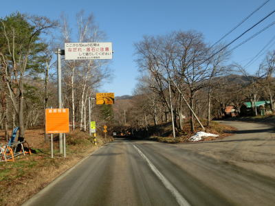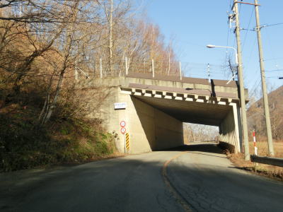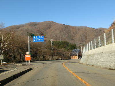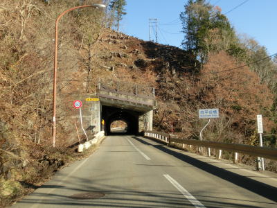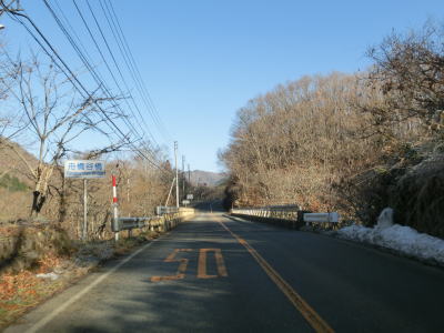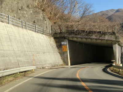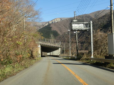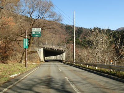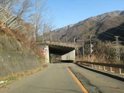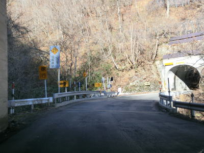 | 舟橋谷橋の手前で幅員減少標警戒標識が立っているが、これは橋上に路側帯がなく狭くなる事を警告している。舟橋谷橋を過ぎて少し進むと12kmに渡ってすれ違い困難なトンネルがある事と15kmに渡って雪崩と落石に注意を促す標識が確認できる。 | ||