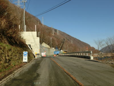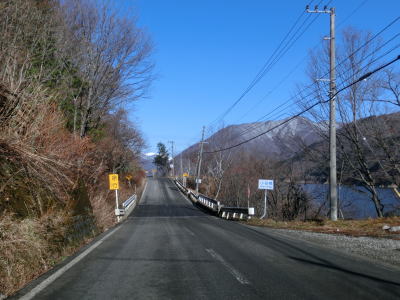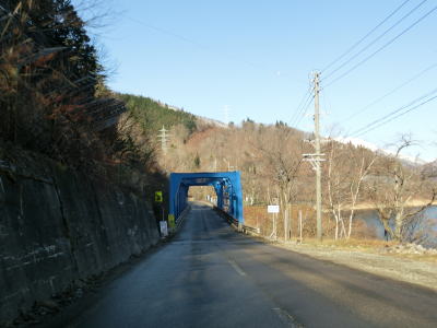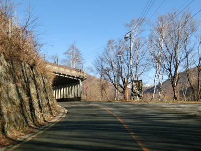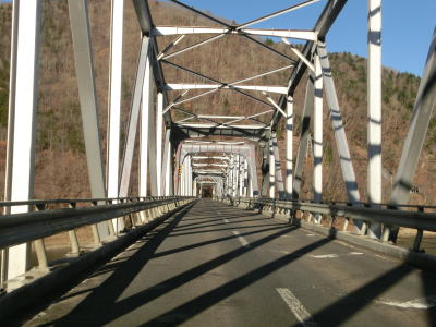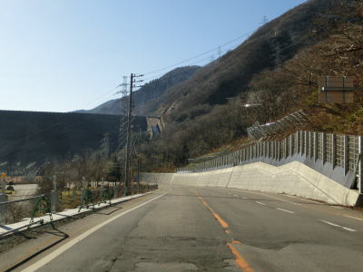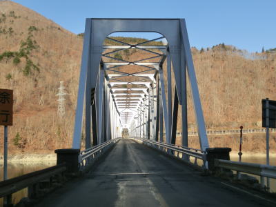 | ダム湖があまり見えない湖畔道路を走っていると鳩谷ダムの西を通過し、その後大牧洞門をくぐる。洞門を出ると緩やかに下りながら大きく右にカーブして大牧橋を渡る。ダムの直下という事もあって川面との高低差が大きい。 | ||