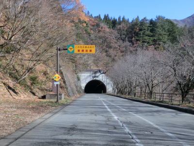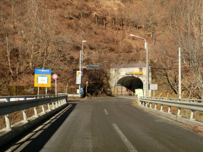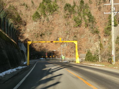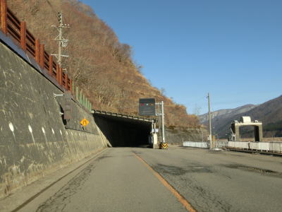 | 荒谷発電所から少し走ると野谷1洞門と野谷2洞門を相次いでくぐるが、どちらの洞門にも3.5mの制限高が設定されている。と言っても制限標識がないところを見ると法的には通行可能可能なのかもしれない。洞門を過ぎると野谷橋を渡ってダム湖の湖畔を快走する。 | ||