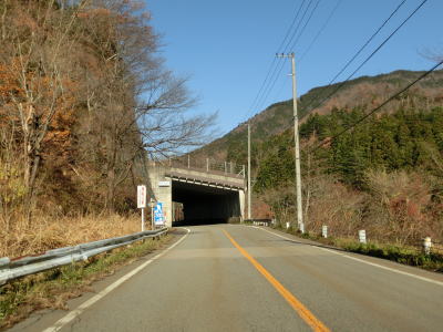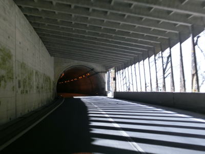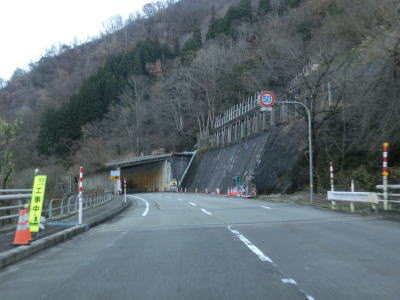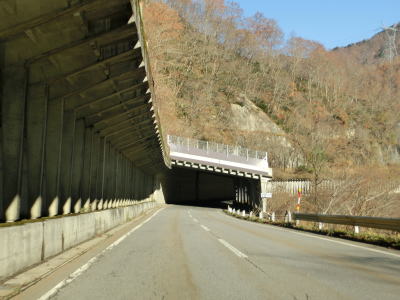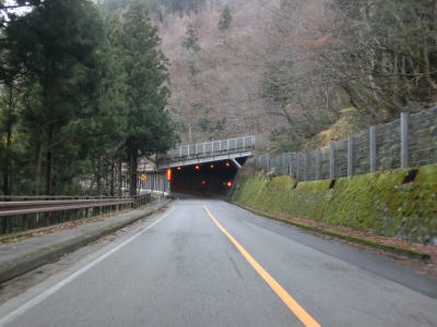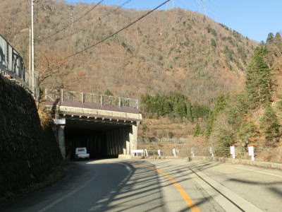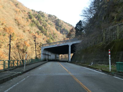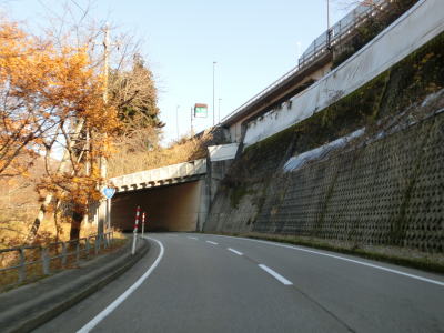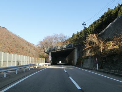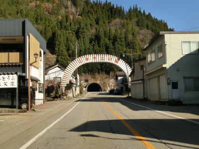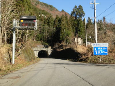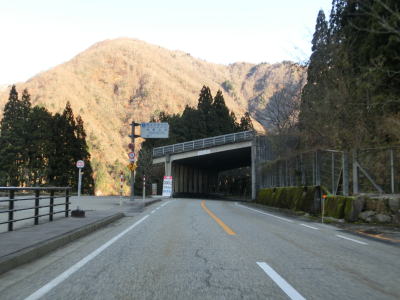 | 湯出島橋は左にカーブしており一旦右岸に移った後に左岸に戻る。白山宮集落を走っていると「こきりこの里」と書かれたアーチをくぐり、その先で上梨トンネルに入る。1977年頃に供用されたトンネルで40年ほど経過しているが、延長は1040mと結構長く狭いながらも歩道が設置されている。 | ||