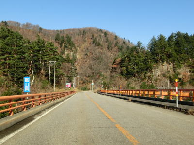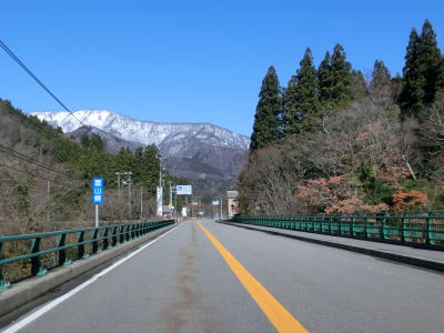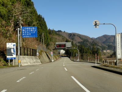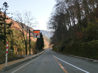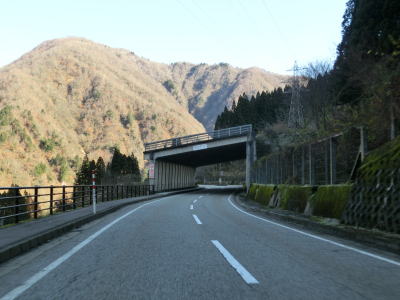 | 赤尾ダムを通り過ぎた直後に道の駅「上平」を通過する。庄川左岸の西赤尾集落を走っていると富山r54交差点を通過する。r54はブナオ峠の北側が実質廃道となっており通り抜ける事ができないようである。r54交差点を過ぎてすぐに右にカーブして新屋橋を渡り、東詰で左カーブを曲がる。庄川右岸の新屋集落は緩やかな上り勾配の直線道路で走り抜ける。 | ||