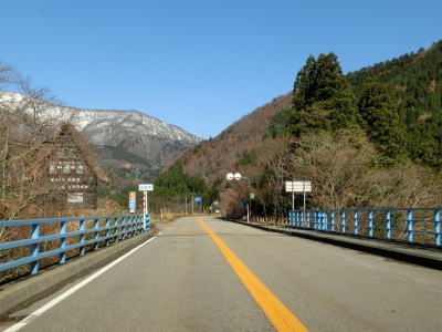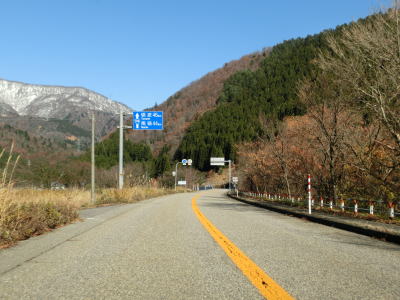 | 鳩谷交差点からも2車線道路が続いており、村役場の東側を走る。沿線には山間部にしては飲食店が多いが、白川郷の観光客向けと思われる。鳩谷交差点から約1.4km走ると東海北陸道の白川郷ICを通過する。本線との距離は意外に離れており、流出道路を2km以上走らなければならない。 | ||