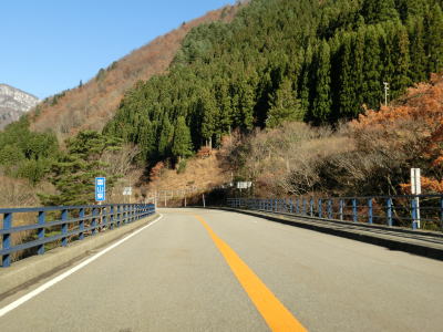 | 小白川集落の旧道との交差点を過ぎてすぐに小白川橋を渡って富山県に入る。楮集落を通り抜けると宮川原橋を渡って岐阜県に入る。集落の西には東海北陸道が通っているのが確認できる。 | ||