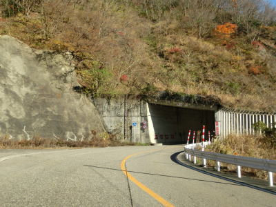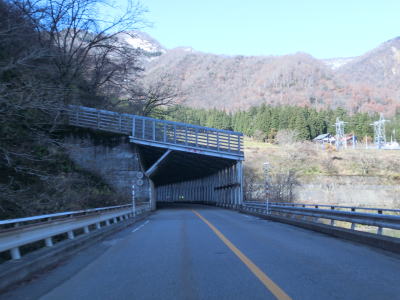 | 祖山スノーシェッドを出て左カーブを曲がると公衆トイレのある簡易パーキングの前を通る。パーキング内には水力発電用の水車が置かれている。簡易パーキングを過ぎてすぐに障子倉スノーシェッドに入り、右の急カーブを曲がる。庄川の左岸を走っていると新山4スノーシェッドに入る。 | ||