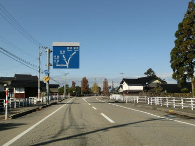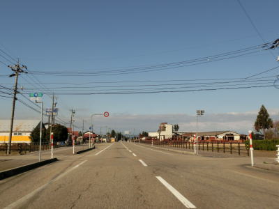 | 平坦な2車線道路をさらに走っていると再び南砺市に入り、信号機もセンターラインの切れ目もない富山r11交差点を通過する。r11交差点の前後は市境が道路上にあり、北が砺波市で南が南砺市となっている。市境並走区間が終わるとやや急な右カーブを曲がりながら富山r280岩屋交差点を通過する。 | ||