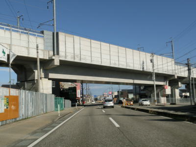 | 断続的に沿線の家屋が続く間を淡々と北上する。富山r57の現道との交差点を通過して少し進むとr57バイパスとの佐野交差点を通過する。左折すればR470能越道の高岡ICに、右折すれば北陸道の小杉ICに行く事ができる。佐野交差点を過ぎてから程なくして北陸新幹線の下をくぐる。 | ||