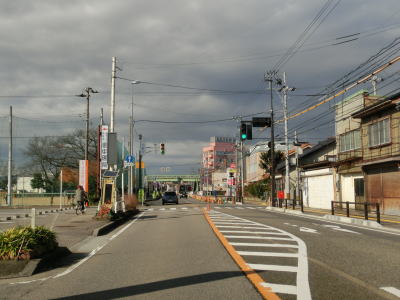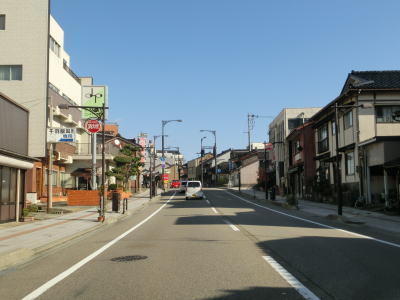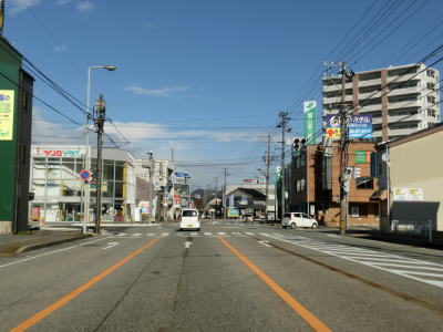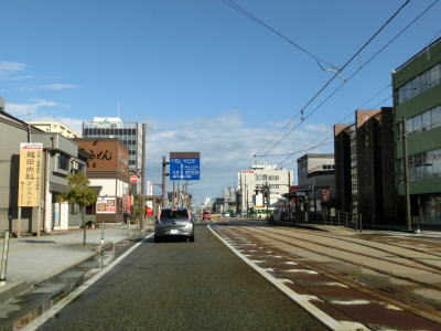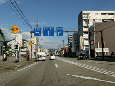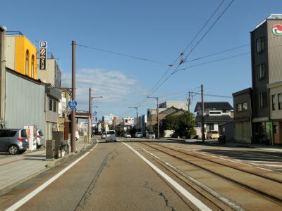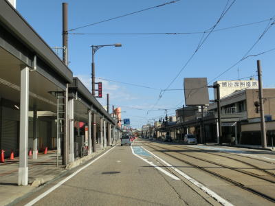 | 南町交差点を過ぎると高岡市の市街地に入るため沿線の建物が密集している間を走り抜ける。店舗を兼ねた住宅らしき建物が多いが、アーケード付きの歩道が設置されており、狭隘な道路ではない。富山r254鴨島交差点を過ぎて少し走ると富山r23・r64片原町交差点を通過する。片原町交差点からは万葉線の路面電車並走区間となっている。交差点からすぐの場所に片原町停留所が置かれている。電車交換ができる停留所だが、乗り場は路面に青色と白線がペイントされただけの非常に簡素なものである。 | ||