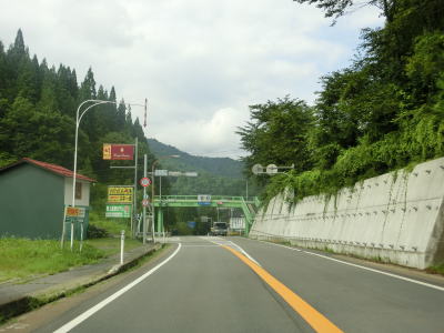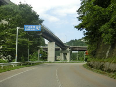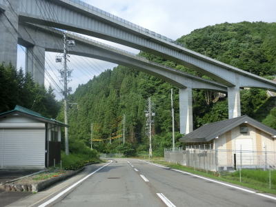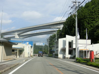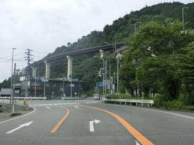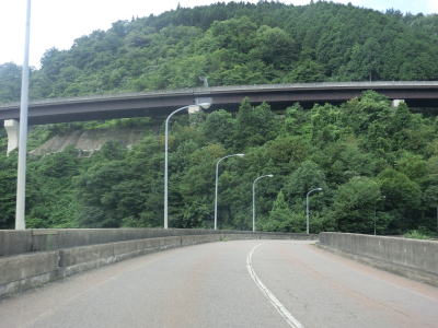 | R158/E67中部縦貫道(油坂峠道路)の向小駄良高架橋の下の7%勾配を上っていると右前方に油坂第7橋が見える。藤路大橋を渡って市道との交差点を通過するが、以降も歩行者と軽車両は通行禁止である。 | ||