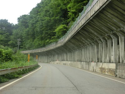 | 中村橋を渡って左カーブの先でロックシェッドをくぐる。その先で西洞大橋を渡るが、その前後で交差している旧道は2022年7月時点でもウオッちずでは国道として表示されている。西洞大橋からは下り勾配となっており、反対側車線には約800mの登坂車線が設置されている。 | ||