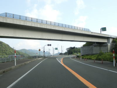 | 福井r215郷市交差点付近からは沿線の建物が多くなる。福井r233美浜駅交差点を通過した先で町道との役場前交差点を通過する。駅と役場の近くを通っている事から美浜町の中心部だと分かる。耳川を渡った後に福井r213河原市交差点を通過すると沿線の建物が少なくなる。 緩やかな左カーブを曲がっていると福井r255との佐柿ランプを通過する。側道がr255だが案内標識にヘキサは表記されていない。r255はR27(とR162)の美浜東バイパスの旧道である。 |