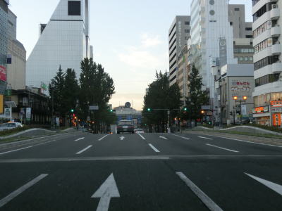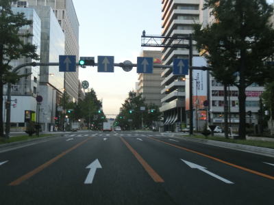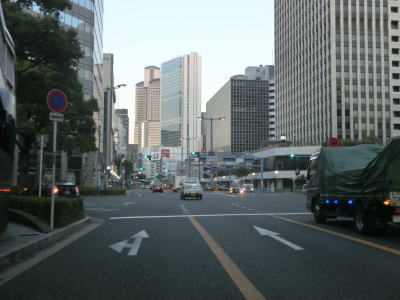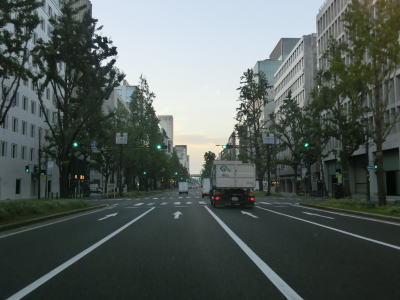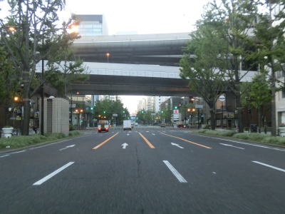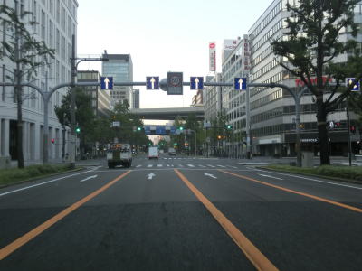 | 堂島川に架かる大江橋を通過する際に阪神高速1号環状線の下を通り、大阪市役所のある中之島を通ってから土佐堀川に架かる淀屋橋を渡る。淀屋橋交差点手前では瞬間的ながら8車線まで増加する。淀屋橋交差点とその手前の淀屋橋北詰交差点間の距離が短いこともあって長さより幅の方が広いように見える。 淀屋橋交差点を過ぎると本線4車線と銀杏並木を挟んで両側に側道1車線ずつの合計6車線となる。大阪の不名誉な名物として路上駐車を思い浮かべる人も多いと思うが、本線に限って言うと路上駐車はあまり見られない。が、側道を一瞥すると早朝にもかかわらず多くの路上駐車車両が停まっている。約1.6km走り地下鉄・御堂筋線の本町駅の上でR25・R26・R172本町3交差点を通過する。 |