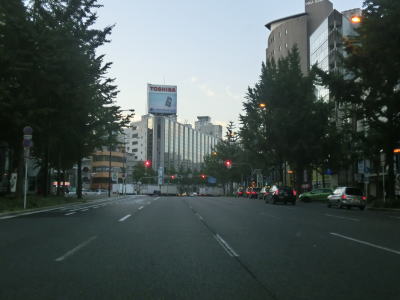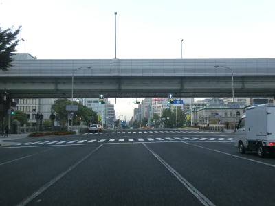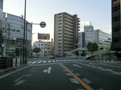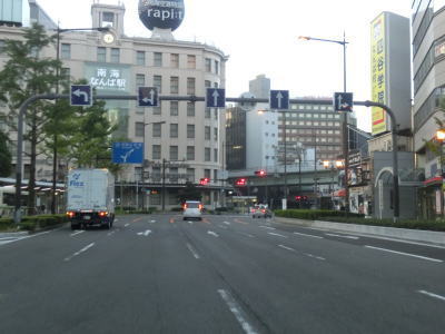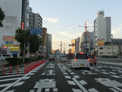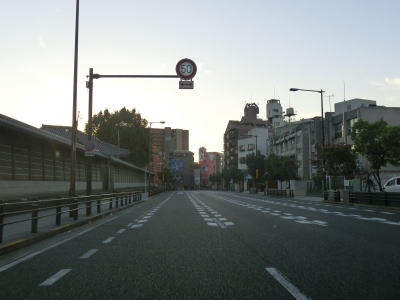 | 阪神高速13号東大阪線と中央通りの船場高架橋の下を通って少し走ると地下鉄・御堂筋線と鶴見緑地線の心斎橋駅の上でR308新橋交差点を通過する。暗峠で酷道として名を馳せるR308も起点は大阪の中心部にある。新橋交差点から約600m走ると道頓堀橋を渡る。所謂ミナミと呼ばれる繁華街なので早朝にもかかわらず人は多い。 | ||