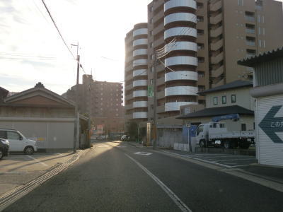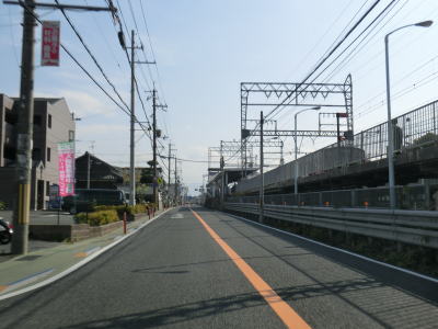 | 63.日之出町交差点を右折 | 64.歩道のない2車線道路が続く | 65.近鉄大阪線 |