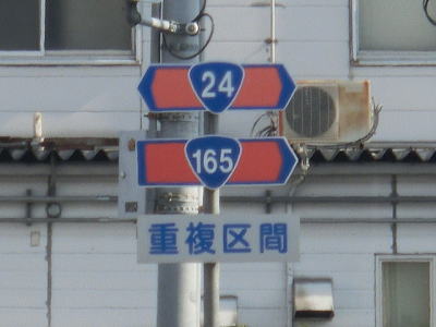 | 四条町交差点からは対面2車線道路となるが交通量は多い。緩やかにS字状にカーブしながら近鉄橿原線の線路を越え、勾配を下り切った所でR24・R166・R169兵部町交差点を通過する。兵部町交差点から少し走ると下りになってJR桜井線のガードをくぐる。案内標識には表記されてないが、兵部町交差点から北はR24・R165・R166・R169の4国道重複区間である。案内標識にも表記されていないくらいだから、もちろん4つ串刺しのおにぎりは設置されていない。 | ||