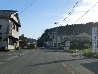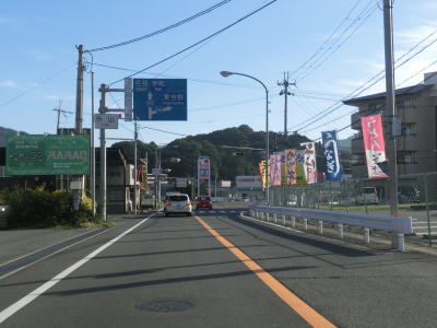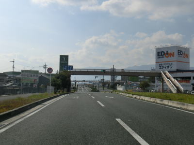 | 勾配がなくなり平坦になった2車線道路を走っているとR166外山交差点に至る。ここでR166が東吉野方面に分岐するため、以東は久しぶりの単独区間である。なお、案内標識では直進のように描かれているが、少し左にカーブしている感じである。 | ||
