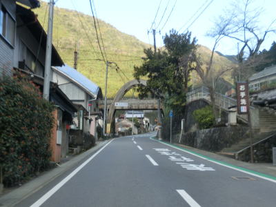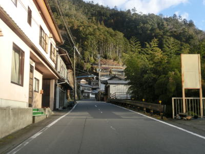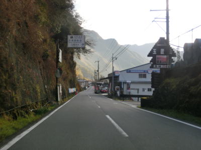 | R425ワラビ尾交差点からは蕨尾集落の中を通っているが、これまでに比べて規模の大きい集落である。道路両側に家屋が並んでいる箇所は2車線であっても狭苦しさが感じられ、またセンターラインが引かれていない箇所もある。ロックシェッドを通過すると左に右に急カーブを曲がった後に廣之前橋を渡る。廣之前橋の東は十津川温泉があるため旅館や商店等もある。 | ||