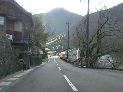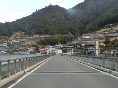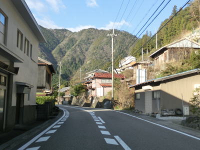 | その後も断続的に続く集落を結びながら2.0〜2車線幅の道路を走る。特別狭い訳ではないが行楽シーズンの休日は交通量が増大する傾向があり、平日は大型ダンプが走っている事が多いので厄介と言えば厄介な区間である。山崎集落で左の急カーブを曲がって折立橋で熊野川を渡って左にカーブし、折立集落を通り抜ける。 | ||