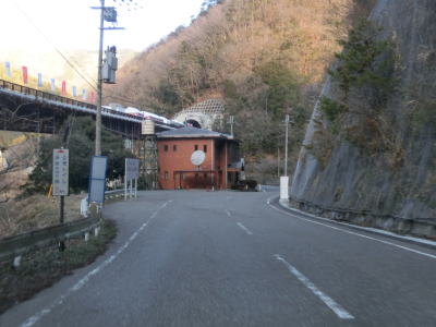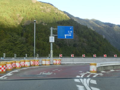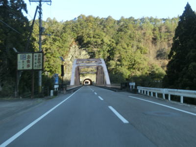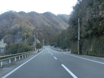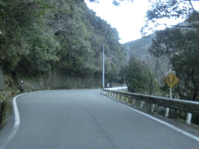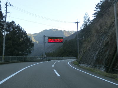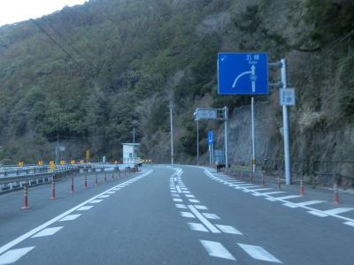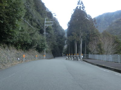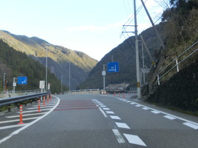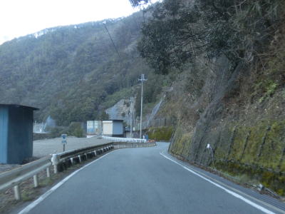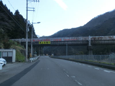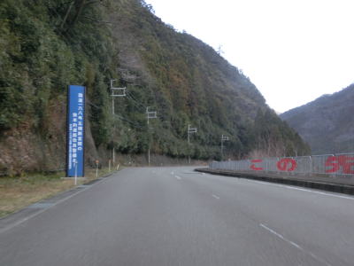 | 熊野川の右岸の緩やかな上り勾配の2車線快走路を走っていると風屋ダムから十津川第一発電所への導水路の下を通過する。そこから少し進むとR168の改良整備を謳う看板が立てられているが、そのすぐ先の風屋ダムの真東に当たる場所で道幅が狭くなる。 | ||