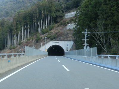| 高原隧道を出ると滝川を渡り、しばらく右岸に沿って上り勾配を走っていると左のヘアピンカーブを通過し、さらに勾配を上る。新宮市の橋本交差点から随分山間部に入ってきたが、標高は300m程度とさほど高くない。津越瀬集落を通り過ぎて程なくして花園隧道を、さらに進み右カーブの直後に風屋隧道をくぐる。どちらのトンネルも1.8〜2.0車線とやや狭く、風屋隧道に関しては前後が急カーブのため対向車を確認しにくい。風屋隧道からは風屋貯水池の湖畔を走っているが、湖面がほとんど見えずダム湖畔を走っているという印象は薄い。 | ||