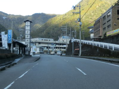 | 小原交差点から熊野川に沿って少し走ると道の駅「十津川郷」を通過する。村役場が隣接しており十津川村の中心と言える場所だが、行政関係の建物が主で一般の家屋は意外に少ない。役場前の右カーブを曲がった先で小原大橋を渡るが、手前で右側に交差している道路は熊野川に沿っている事からも旧道と思われる。1.5〜1.8車線の狭路ながら沿線に集落があるため閉鎖されておらず通行できる。小原大橋を渡ると右にカーブして湯之原トンネルをくぐり、出た所で湯之原橋を渡って旧道との交差点を通過する。 | ||