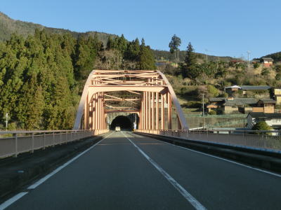 | 高津トンネルを出てすぐに道路建設工事現場を右折させられる。案内標識が設置されてないのは川津道路と呼ばれるバイパスが開通するのが走行した日であったためである。開通する時間までまだ9時間程あったがすでに誘導員(?)等がいて開通式典の案内図を設置している作業員も見られた。さすがに9時間も待ってられないので河津大橋と国王トンネルを見ながら右折して現道に進む。 現道と言えども2車線道路で決して走りにくい道路状況ではない。と言いたいところだが、河津橋が1.5車線幅しかない。その後、バイパスの河津大橋の真下だけはセンターラインがあるが、以降は1.5車線狭路が続く。 |