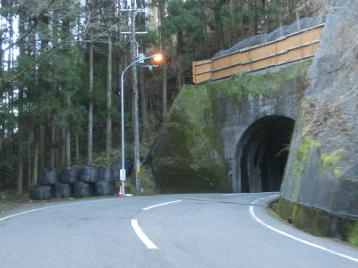 | 上野地トンネルを出て右にカーブしている小栗栖橋を渡るとセンターラインがなくなり道幅が狭くなる。小刻みにカーブしている1.5車線幅道路を300m程走るとセンターラインが復活して2車線道路になる。川沿いを少し走った後に新旭橋で熊野川の支流の旭川を渡ってから田長瀬トンネルをくぐる。その後、田長瀬橋で熊野川を渡って岩原トンネルをくぐり、さらに小休場橋で熊野川を渡る。橋梁とトンネルが連続している事からも元々川沿いの道路が旧道と分かる。 | ||