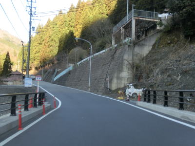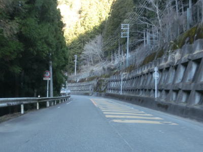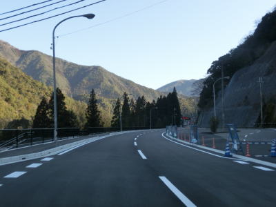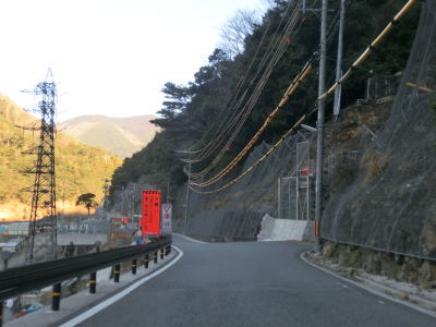 | 小休場橋を渡って旧道との交差点を通過し、右にカーブするとセンターラインがなくなって1.5車線狭路となってしまう。乗用車同士なら多少減速すれば離合できる程度で強烈な狭さという訳ではないが、交通量が道路状況の割に多いうえに見通しの悪いカーブが多いので厄介である。場所柄工事関係と思われる大型ダンプの通行も少なくない。夏期や紅葉期にはこれらに観光客の車が加わる。 | ||