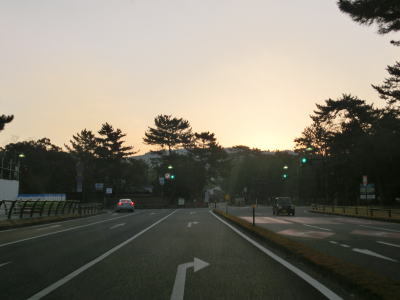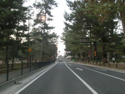 | JRの奈良駅や近鉄奈良駅、奈良市役所からは離れているが、奈良県庁の南東に位置するR369県庁東交差点がR169の起点である。格下の国道との交差点が起点となっている事に違和感を覚えるが、現在のR369はかつてR24だった区間であり制定当初は二桁国道との交差点であった。 昼間であれば混雑してそうな県庁東交差点を南に向かって進む。西には興福寺、東には国立博物館があり、敷地には多くの鹿がいる。荒池にかけて鹿に注意を促す標識や路面ペイントが施されている。ここで言う鹿は野生のものではなく公園にいる鹿を指すのは言うまでもない。 |