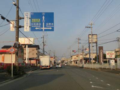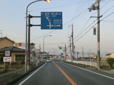 | 箸中南交差点から約3.3kmでR165・R166谷交差点に突き当たる。案内標識にR169は表記されていないが、右折して大和高田・橿原方面に向かって進む。同じく案内標識に現れていないR166はR165の両方向に重複している。 谷交差点からはR165・R166・R169の3国道重複区間となるが、歩道のない対面2車線道路と交通量の割に貧弱な道路状況と言わざるを得ない。谷交差点から約500m西の阿部交差点でR169桜井バイパスと合流する。南には奈良r15が接続しているが、吉野・明日香と案内されている事からも分かるが、この先でR169と交差しておりそちらの方がより短い距離で到達する事ができる。 |