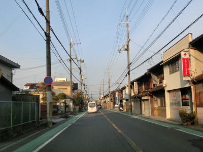 | 荒池を通り過ぎて少し進むと奈良r80福智院北交差点を通過し、以降の沿線の風景は普通のものに変化する。しばらく2車線道路を走っていると市道との紀寺交差点を通過するが、この交差点はただの直進ではなく少し右にずれるようにS字カーブを描きながら進む。 | ||