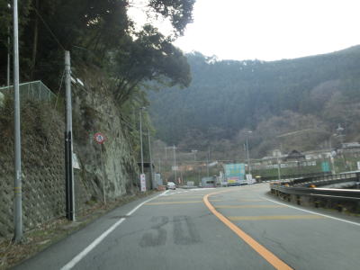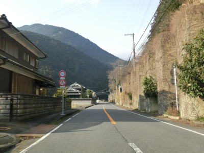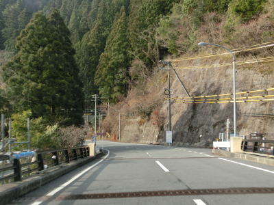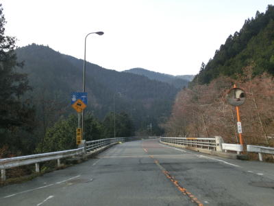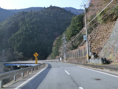 | R370宮滝大橋北詰交差点を通過してすぐに宮滝大橋で吉野川を渡る。橋を渡り終えてからは上り勾配になり吉野川を離れる。谷筋を走っていると中山トンネルをくぐり、トンネルを出ると右にカーブして樫尾集落を通り抜ける。左側には吉野川が流れているが、高低差が大きいため水面は見えない。 | ||