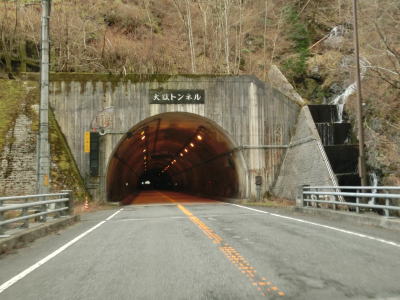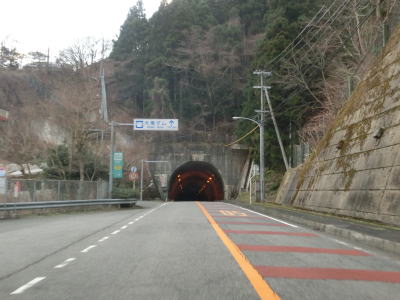 | 緩やかなS字カーブを曲がった先で伯母谷トンネルに入る。トンネルの手前には旧道が交差しており、旧道の沿線に家屋がいくつかあるため閉鎖されていない。旧道は崩れやすい場所を走る山岳狭路で、家屋より奥はほぼ放置状態のため車両での通行は適していない。伯母谷トンネルを出ると栗の木トンネルと滝の脇トンネルを相次いでくぐる。滝の脇トンネルの坑口のすぐ脇に大曲滝が流れている。 | ||