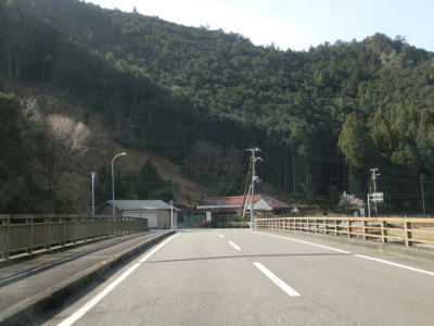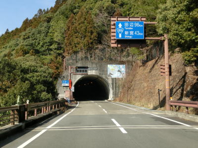 | 平瀬橋の勾配が平坦になった所で玉置口トンネルに入り、次いで竹筒トンネルに入る。全長968mの竹筒トンネルの中央辺りに県境があり、南は奈良県十津川村である。北側の新宮市は飛び地であったが、こちらの十津川村は飛び地ではない。ただし、十津川村中心部どころか他の集落に直接繋がっている道路はなく、実質的には飛び地と言える場所である。 | ||