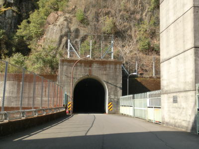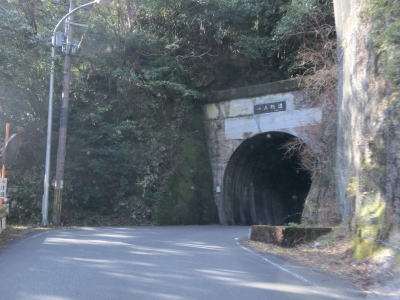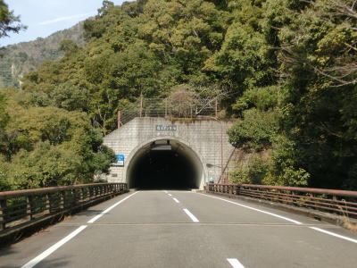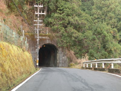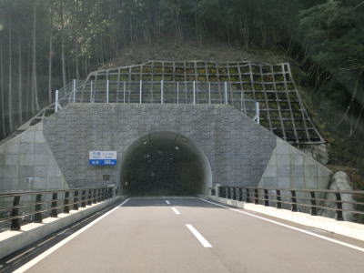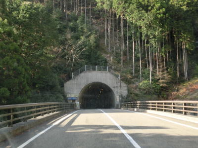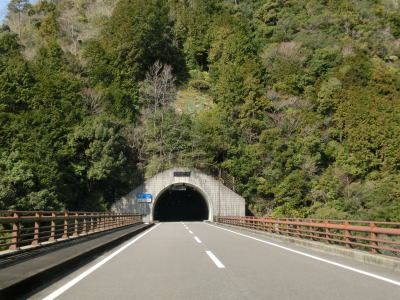 | 五郷町交差点から約1.1km走るとセンターラインがなくなり1.5車線幅の大井谷トンネルに入る。内部での離合はできないが、中央付近が拡幅されておりそこだけは離合可能である。トンネルの全長は315mである。大井谷トンネルを出ると緩やかに下り、セメント工場(?)の前で市道との交差点を通過する。行止りの短い市道だが集落があるため通行可能である。 | ||