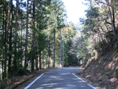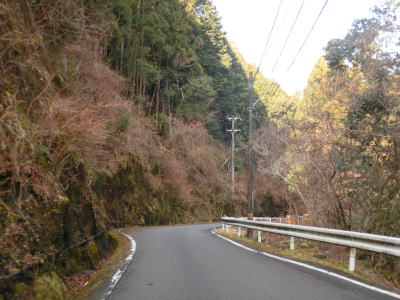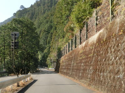 | センターラインがなくなってからは1.5車線幅の狭路を走る。これまでの狭路区間とは異なりカーブは少なく見通しは比較的良い。S字状にカーブした先で四ノ川橋を渡る。橋の西詰には四ノ川沿いに奥まで入る村道(林道?)が交差している。その後も狭路が続き、沿線に数軒の家屋と作業場が建っている。雨谷橋を渡った直後に左急カーブを曲がり、程なくして左にカーブした後で田岡谷橋を渡る。いくつもの谷川を渡るが、全て道路の左側を流れている北山川に注いでいる。 | ||
