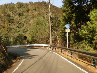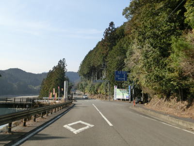 | 大井谷橋を渡り、大井谷川沿いを走る。勾配は非常に緩やかなので気にならないが、道幅が狭いうえにブラインドカーブが連続しており対向車の存在が常に気になって神経をすり減らす走行になってしまう。大井谷川が北山川に合流して以降は北山川に沿って走る。沿線に集落は存在しないが、七色貯水池に一体化している場所のため、1軒だけレンタルボート屋がある。 | ||