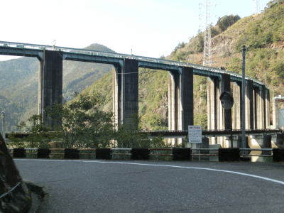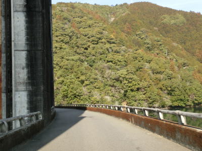 | 三重r738交差点を曲がると七色ダムの天端を走る。アーチ式ダムのためカーブしているうえにゲート開閉用のタワーが高いため見通しは良くない。ダムが造られている北山川は県境の川のためダムを通る事で和歌山県北山村に入る。ダムの西岸に着くと七色ダムトンネルに入る。左にカーブしたトンネルを出ても引き続き1.5車線幅の狭路を走る。 | ||
