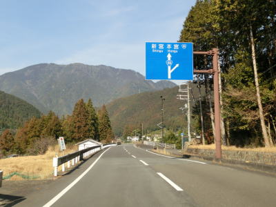 | 神下交差点のすぐ西にも村道との交差点があるが、これは北山川近くの田戸集落とを結んでいる。葛川沿いの村道が通じているため田戸集落は実質的飛び地にはなっていない。なお、田戸集落に瀞八丁展望所に三県境の看板が立てられており、展望所から見える場所に三県境がある。 下り勾配の葛川大橋を渡ると和歌山県新宮市に入るが、ここは旧熊野川町だった場所で三重県と奈良県に囲まれた飛び地である。葛川大橋の上流に田戸橋が架かっているが、これは旧道に当たる。新宮市に入ってすぐに湯谷4号橋、3号橋、2号橋、1号橋と順に渡っていく。4号橋と3号橋にはそれぞれ山肌に旧道が残っているが、全く管理されていないようで荒れている。2号橋と1号橋の旧道は繋がっており田戸隧道やその奥の玉置川集落(十津川村)へのアプローチ路として通行可能である。なお、旧道は2017年3月時点でもウォッちずでは国道として扱われている。 |