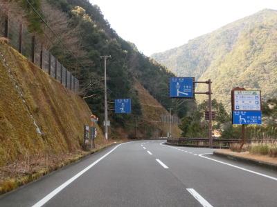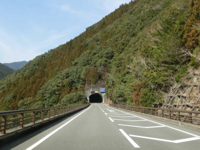 | 山肌の旧道と少し並走した後に瀞峡トンネルに入る。瀞峡トンネルは2049mの長大トンネルで、2008年に開通している。それ以前の田戸隧道を含む区間は酷道であった。ウォッちずでは旧道も国道として扱われているが、田戸隧道の西側の村道交差点から南は2011年に発生した土砂崩れのため通行不能となっている。沿線に集落もない事から復旧される可能性は低いと思われる。 瀞峡トンネルを出た直後に旧道との交差点を通過するが、前述の田戸隧道方面へ戻る方向で前述の通り通行不能である。左折は瀞峡道路U期工事の旧道であり、沿線に集落もある事から通行は可能である。その旧道との交差点を過ぎると平瀬橋を渡るが、高所を通る急勾配の橋である。 |