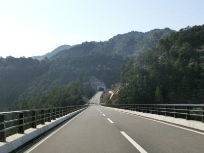 | 小松トンネルを出た直後に有蔵4号橋を渡り、以降3号橋、2号橋、1号橋を順に渡り、1号橋の直後に有蔵トンネルに入る。有蔵トンネルを出ると立合川橋を渡ってから東野トンネルに入る。小松橋から東野トンネルにかけての区間は1996年に開通したが、それまでは点線区間、つまり車道としては分断されていた。 東野トンネルを出てすぐに村道との神下交差点を通過する。葛川に沿った山間部を通っている村道で、かなりの山間部にもかかわらず沿線にはいくつかの集落がありバス路線でもある。 |