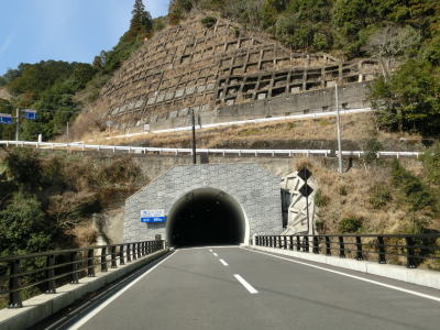 | 現道との交差点を過ぎてすぐに三津野高架橋を通る。全長1km程の橋で、高架橋という名称が示す通り河川だけでなく田畑や農道も越えている。大きく右にカーブした後に左にカーブして現道の連絡道との田長交差点を通過する。田長交差点からのカーブを曲がっていると田長トンネルに入る。トンネルを出ると現道との交差点を通過する。三津野高架橋と田長トンネルは歩行者・軽車両・自転車の通行が禁止されており、そのため日足バイパス開通後も現道が国道の指定を受け続けているものと思われる。 | ||