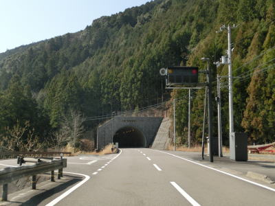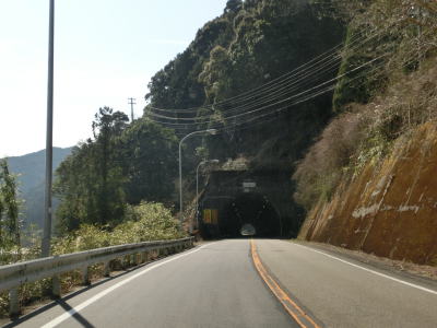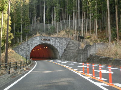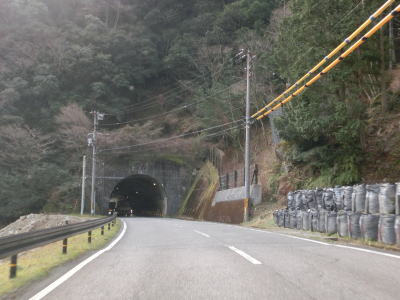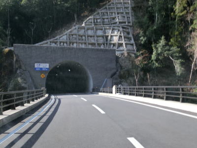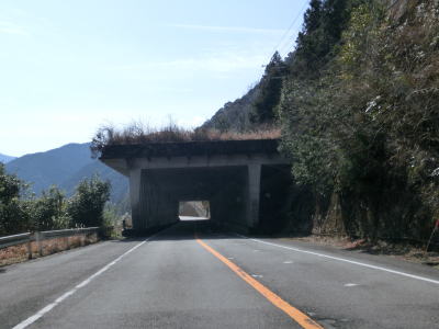 | 九重トンネルを出た直後に旧道との交差点を通過する。左手に北山川を見ながら緩やかなカーブとアップダウンのある2車線道路を快走する。浦地集落を通り過ぎると四瀧トンネルをくぐるが、川寄りの旧道は沿線に集落のない1.0車線幅狭路だが、川の水位計があるためか現在でも通行可能で国道の指定も外れていないようである。四瀧トンネルを出ると旧道との交差点を通過して、引き続き2車線道路を走る。 | ||
