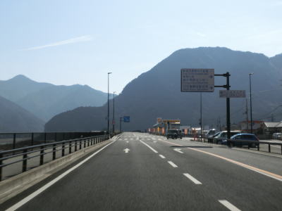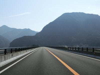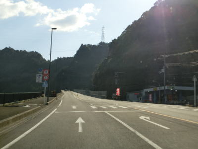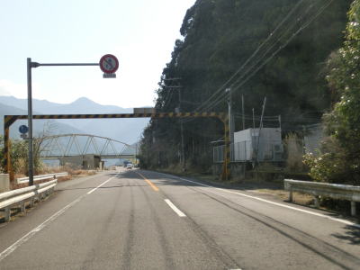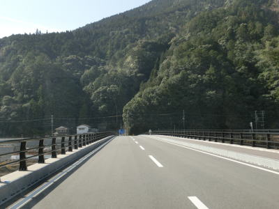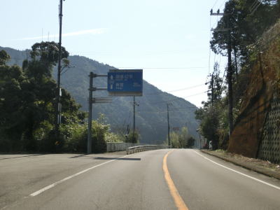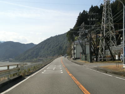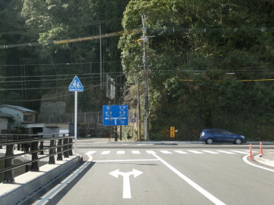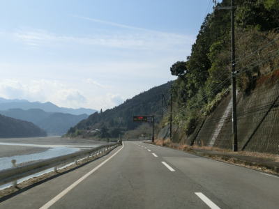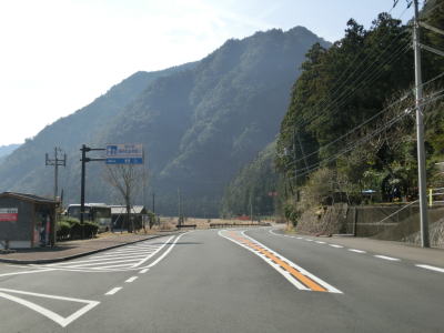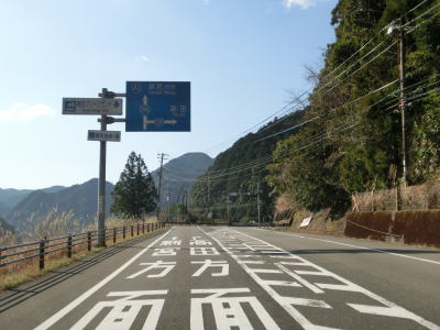 | 吊鐘隧道を過ぎると熊野川の対岸には比較的大きな集落が見える。一方でR169(実質R168)はカーブが連続する区間となっており、その中には1ヶ所だけ急カーブも含まれている。急カーブを通過してから程なくして和歌山r230相賀橋北詰交差点を通過する。案内標識だけでなく路面にまで行き先がペイントされているが、高田方面のr230は行止り県道である。相賀橋北詰交差点以降も熊野川に沿った2車線道路が続いている。 | ||