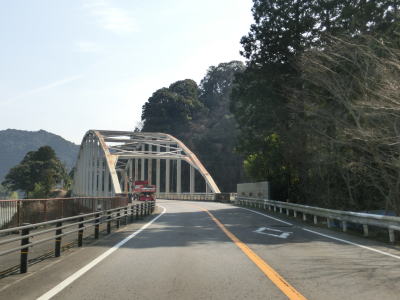 | 北山川の右岸を淡々と走る。国道沿線に集落は存在しないが、対岸の三重県熊野市には三重r740が走っており集落が存在している。宮井集落で勾配を上りながらS字カーブを曲がって宮井大橋で熊野川を渡る。この宮井大橋もかつては1.5車線幅の橋だったが、上流側に新たな橋が架け替えられて2車線に改良された。橋の南詰でR168・R311宮井交差点に突き当たる。案内標識にはR311のおにぎりはあってもR169のおにぎりはないが、左折してR168重複区間を新宮方面に進む。R311はR168を本宮まで重複している。 | ||