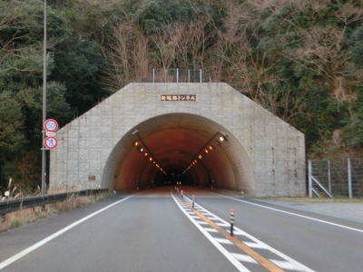 | 上り勾配の南桧杖橋を走った後に新越路トンネルに入る。トンネル内部は余裕のある2車線だが歩道(?)は非常に狭く歩行者同士のすれ違いも困難である。トンネルを出るとすぐに越路トンネル東交差点を通過するが、交差点から左斜め後方に延びている道路が越路隧道を含む旧道である。越路隧道は元々1.8車線幅だったものに歩道が造られているためさらに狭くなっている。 | ||